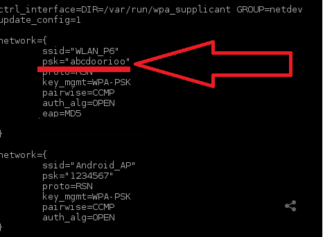 - Готово, вы увидите список всех беспроводных сетей, к которым когда-либо подключались. Выбирайте ssid интересующей сети и смотрите напротив «psk» пароль от данной сети.