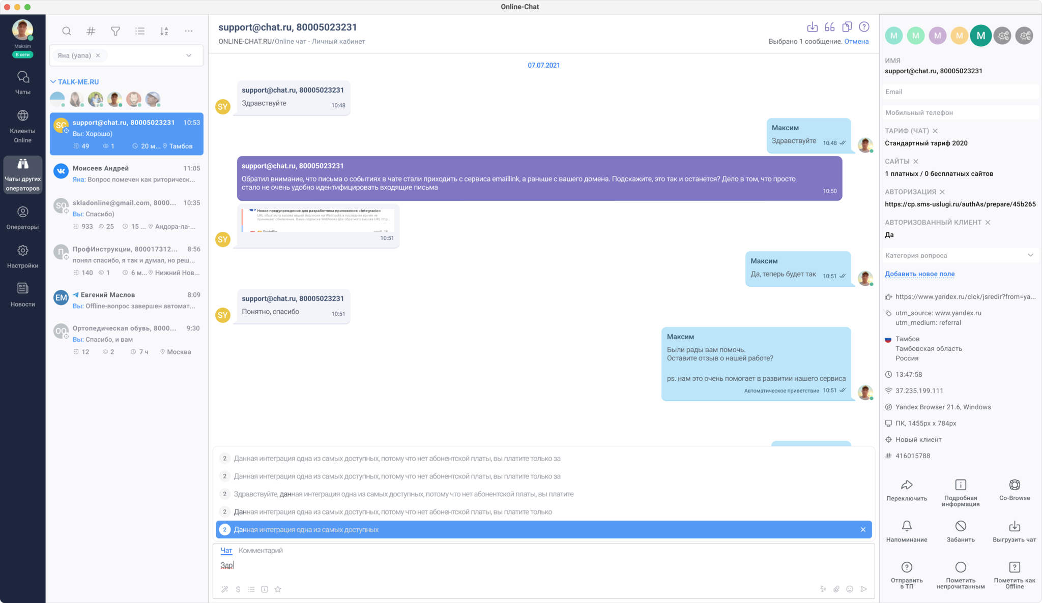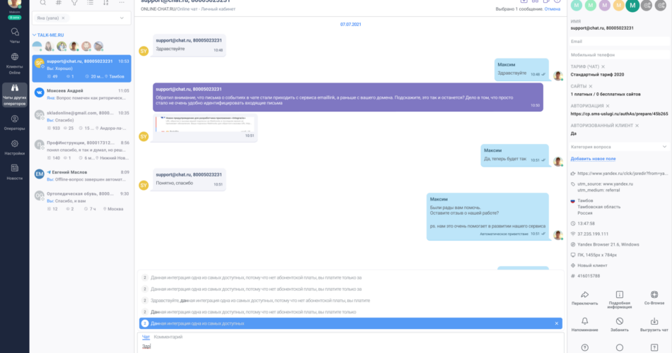 Чат для сайта Talk-me предоставляет компаниям возможность проводить анализ эффективности коммуникации с клиентами и получать детальные отчеты о работе онлайн консультантов.