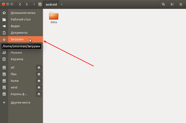В папке: android, нажатием пр. кнопки мышки, в контекстном меню создаём папку: data и слева, в колонке, жмём на: Загрузки