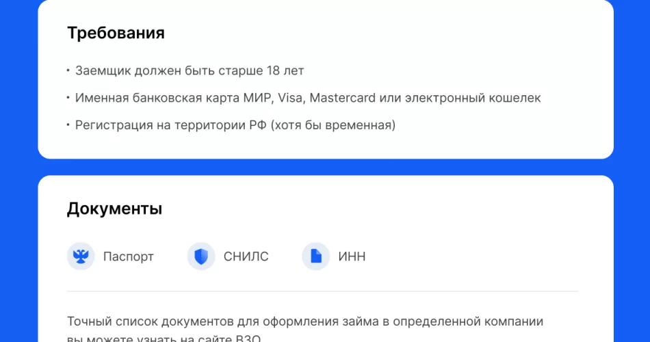 Несмотря на обещания выдачи займов без проверок, у микрофинансовых организаций есть ряд минимальных требований к клиентам. В первую очередь, заемщик должен быть совершеннолетним и иметь постоянную регистрацию в России. Это базовые условия, необходимые для оформления любого микрокредита. Многие МФО также требуют наличие паспорта и номер телефона.