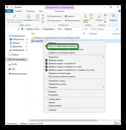 - запустить установку CCleaner от имени администратора. Для этого нужно щелкнуть на значке установки правой кнопкой мыши и выбрать в контекстном меню пункт «Запуск от имени администратора».