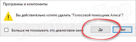 После этого появляется предупреждение об удалении программы. Здесь нужно просто нажать на кнопку «Да».